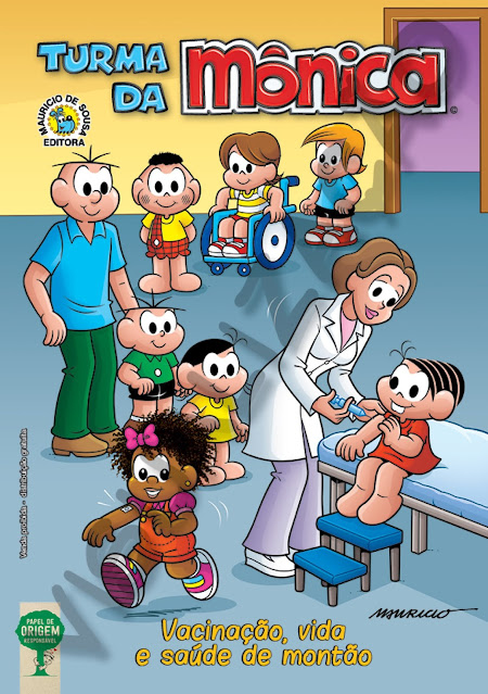 No gibi “Vacinação, Vida e Saúde de Montão”, Mônica e seus amigos viajam numa máquina do tempo, contando a história das vacinas e de como o vírus da gripe ataca o organismo.
