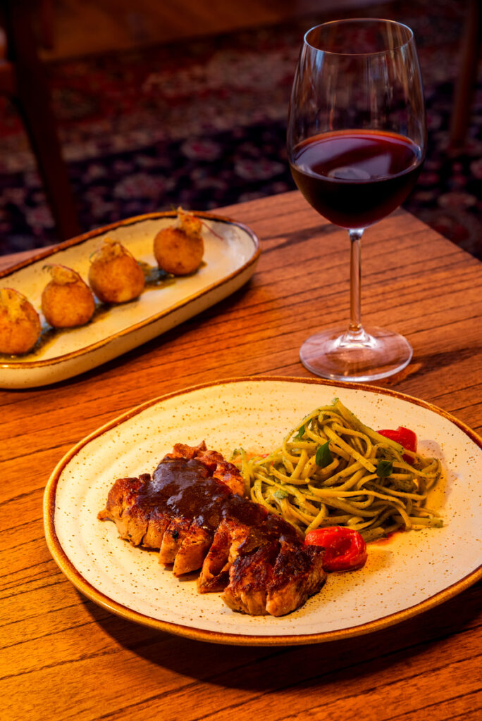 As massas frescas conduzem o cardápio, com destaque para o pappardelle ripiene com ragù de javali, finalizado com castanha de caju e maçã verde, e para o clássico rigatone alla carbonara. Entre os principais, o ossobuco alla milanese divide espaço com o filhote grelhado servido com fregola e beurre blanc de mariscos.